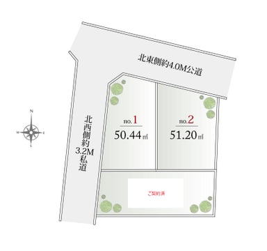 | 建ぺい率/容積率 | 60%/200% | 接道 | 角地 北東側幅4m 北西側幅3.2m |