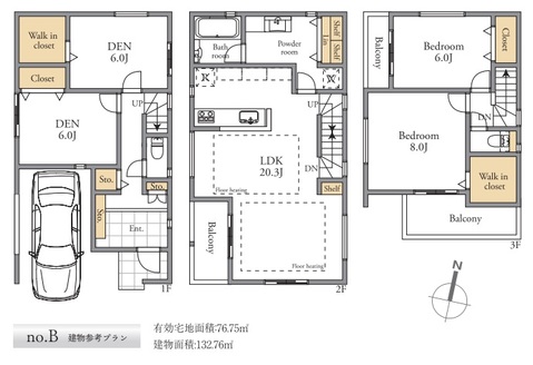 | 土地面積 | 76.7m²(実測) | 建物面積 | 132.76m²(実測) |