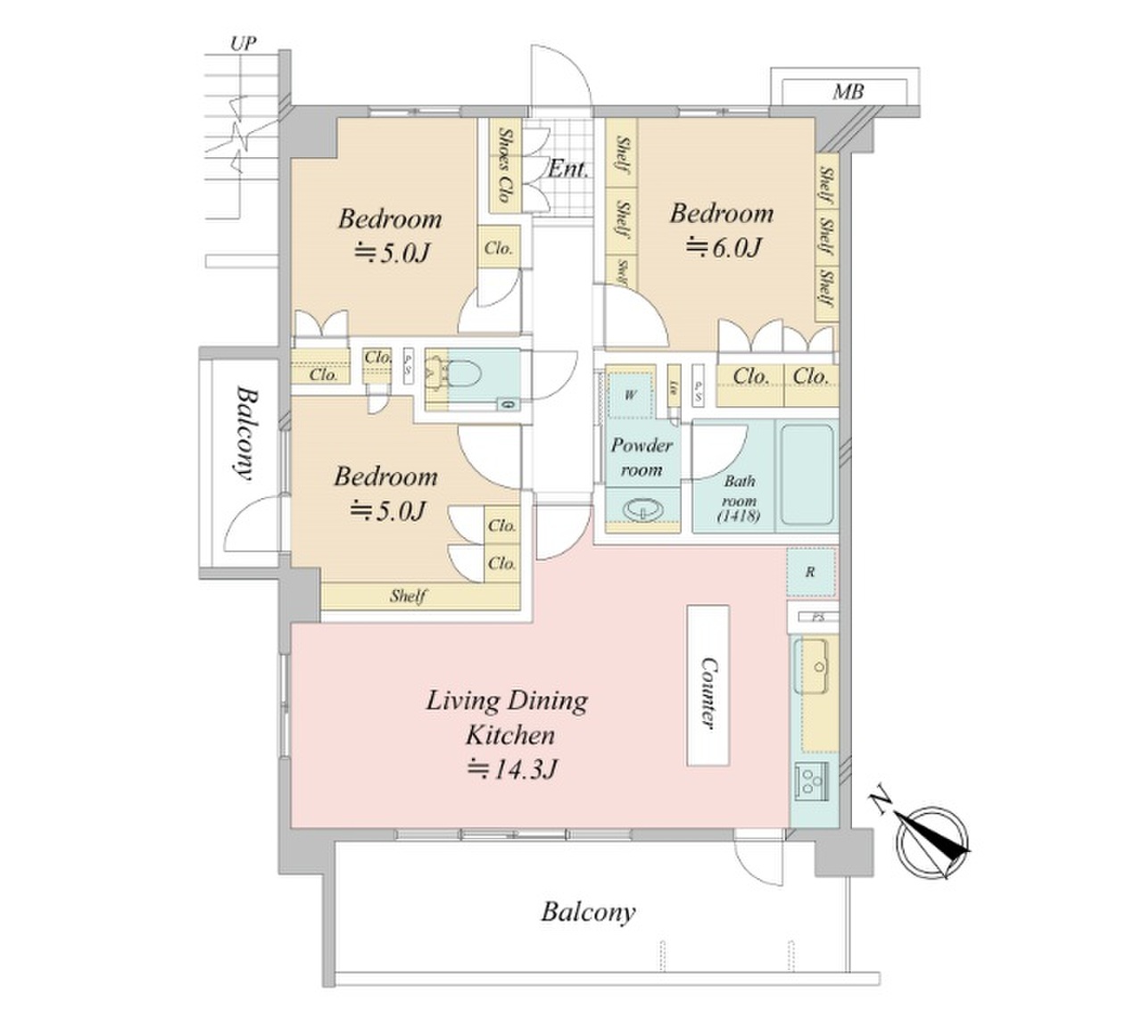 | 専有面積 | 63.8m²(壁芯) | バルコニー面積/向き | 14.22m²/南西 |