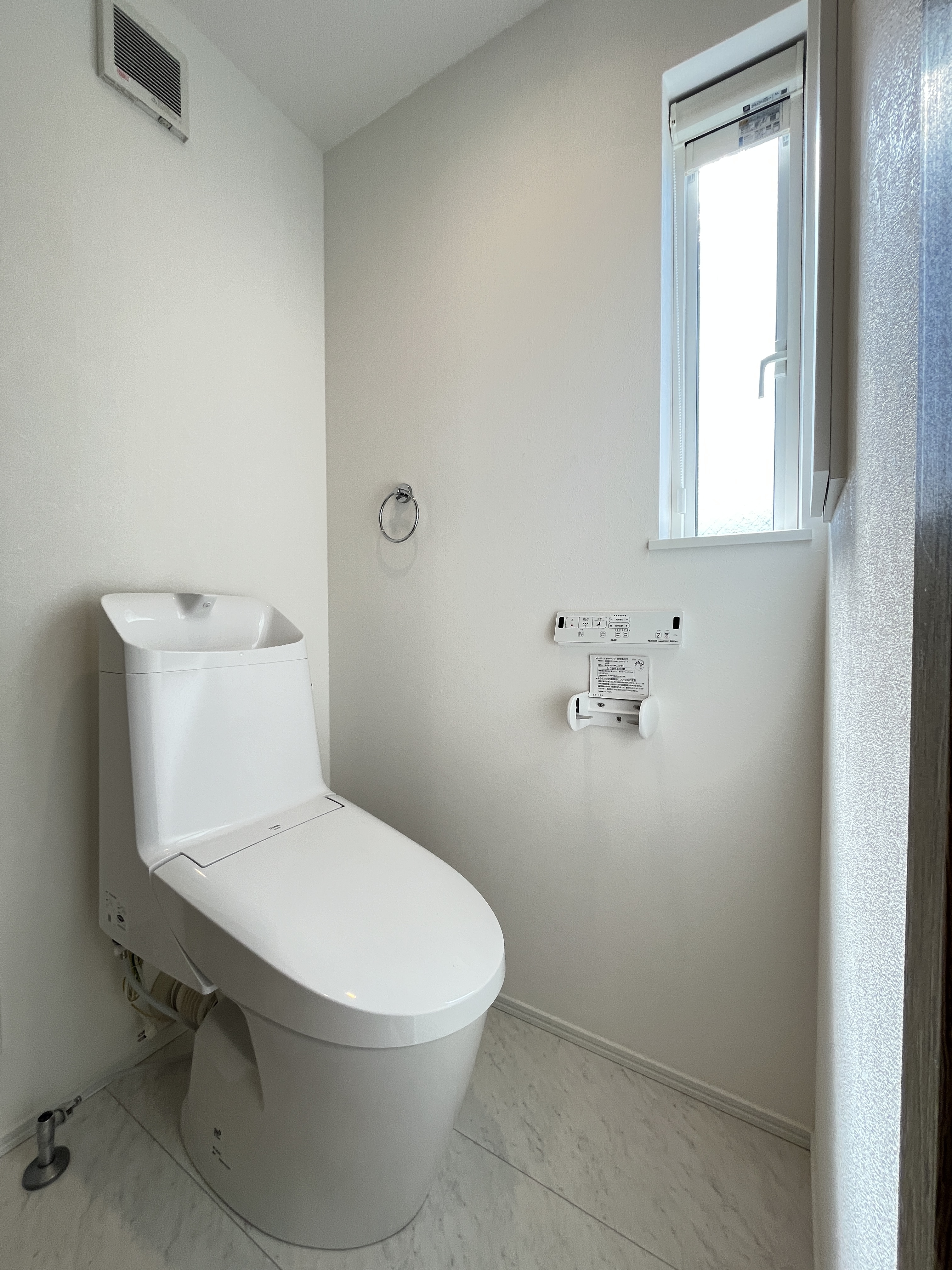 窓付きで換気もスムーズな清潔感溢れるトイレ。温水洗浄便座完備で、毎日を快適に過ごせる空間です。 -