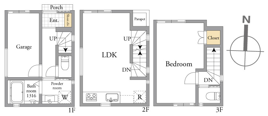 大切な車を守るガレージ付き3階建て。2階にLDKを配し、プライバシーと開放感を両立した間取りです。