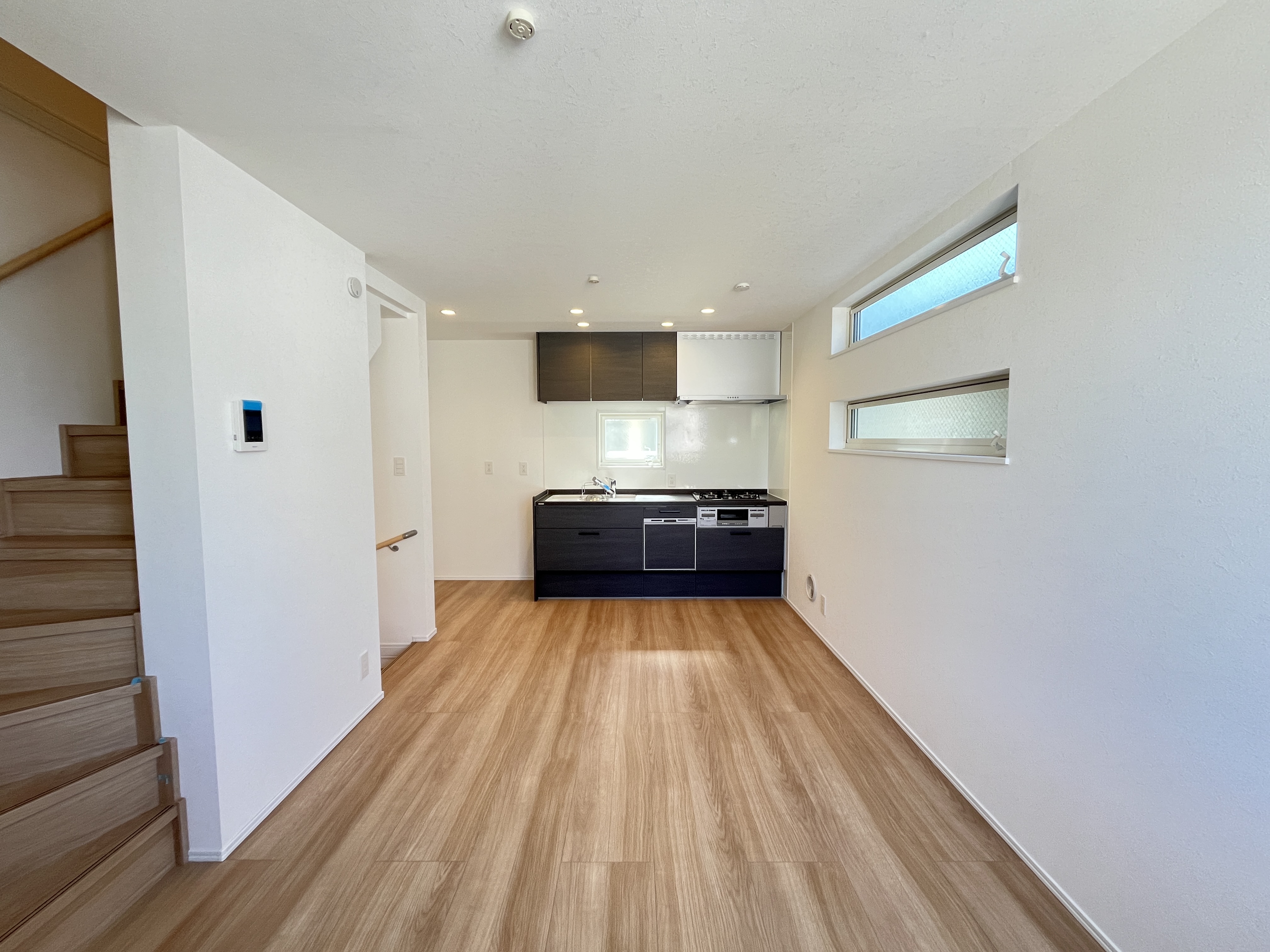 家族の会話が弾む開放的なLDK。キッチンからリビング全体が見渡せる、安心感のある住空間です。 -