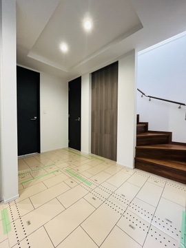 玄関ホールです。照明が優しく温かい空間を演出。広々としており毎日の出入りも快適です。 -