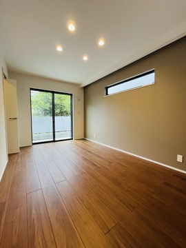 大きな窓から自然光が差し込む明るい洋室。ダウンライトを採用し、スッキリとした居心地の良い空間です。 -