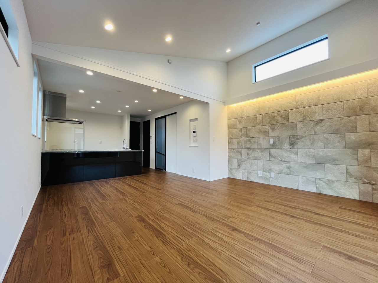 開放感あふれる広々としたリビングダイニング。こだわりのアクセントウォールと間接照明がお洒落な空間です。 -
