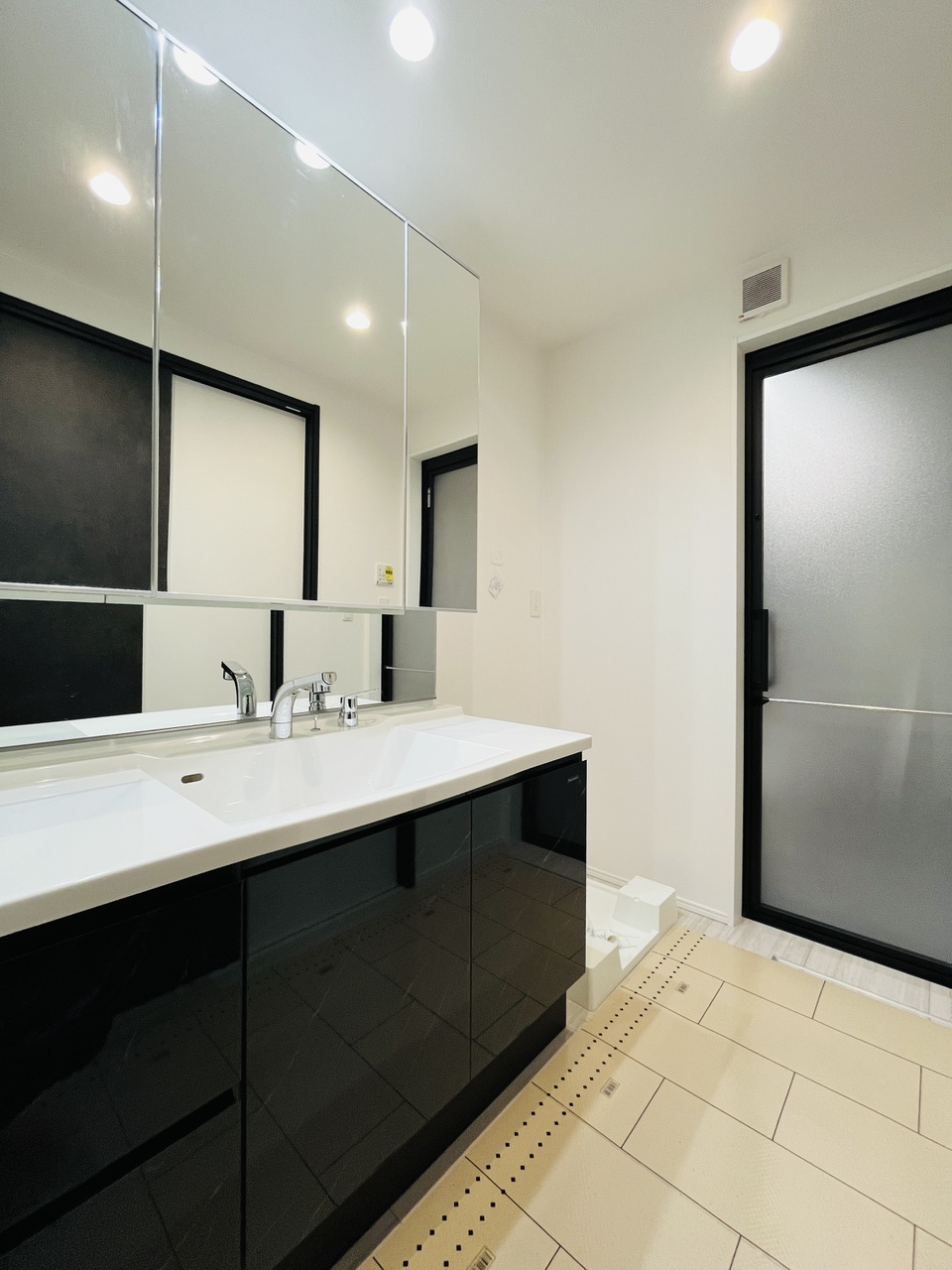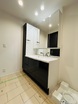 大きな鏡を備えたワイドな洗面台です。ゆとりある広さの洗面空間で、忙しい朝の身支度もスムーズです。 -