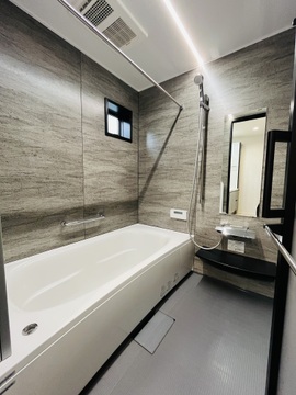 落ち着いたトーンの広々としたバスルーム。小窓付きで換気もしやすく、一日の疲れをゆっくりと癒やせます。 -