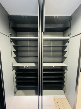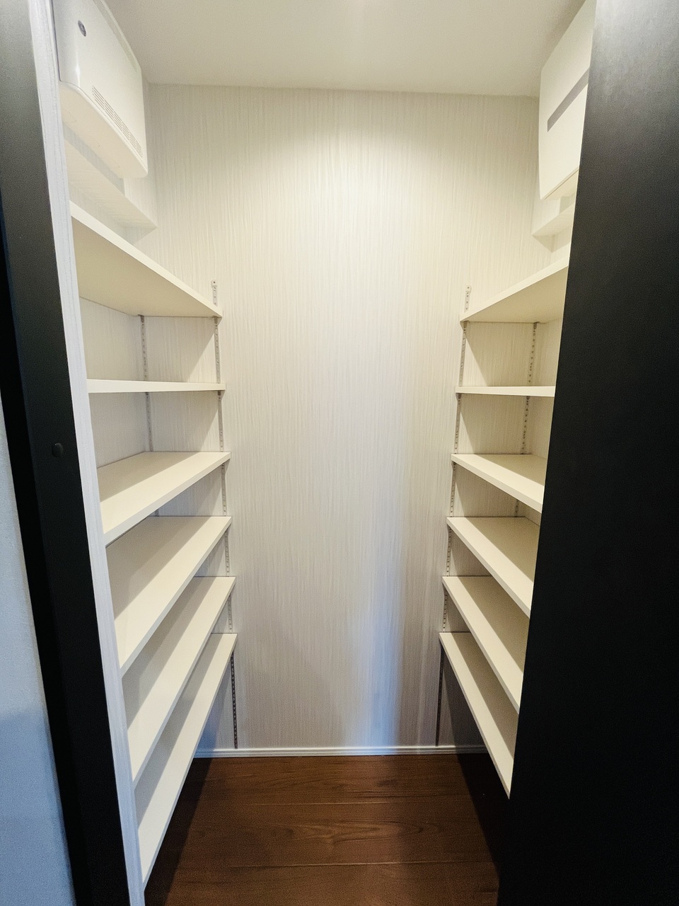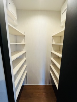 両サイドに棚を備えた大容量の収納スペース。日用品のストックや季節のアイテムなどもすっきり片付きます。 -