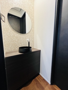 スタイリッシュな手洗いスペース。丸い鏡と落ち着いた色合いのキャビネットがお洒落です。 -