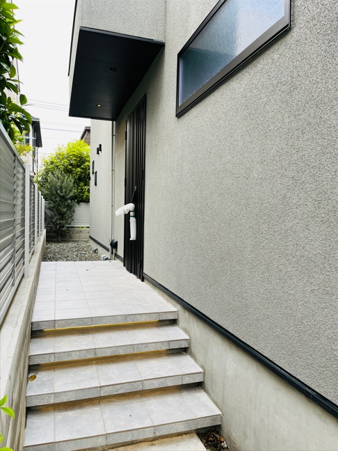 玄関へのアプローチ部分です。適度な段差が道路からの視線を遮り、プライバシーを守る安心の設計です。 -
