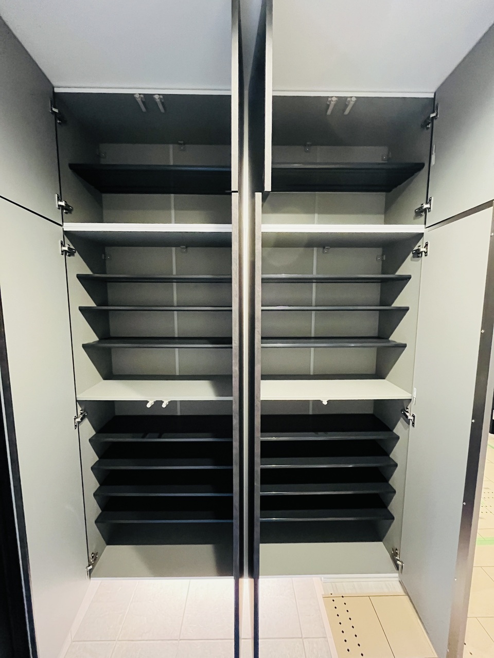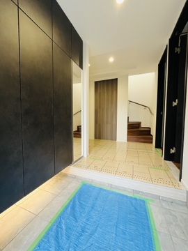 玄関には高さのある大容量シューズボックスを設置。ご家族の靴もすっきり収納でき、玄関を綺麗に保てます。 -