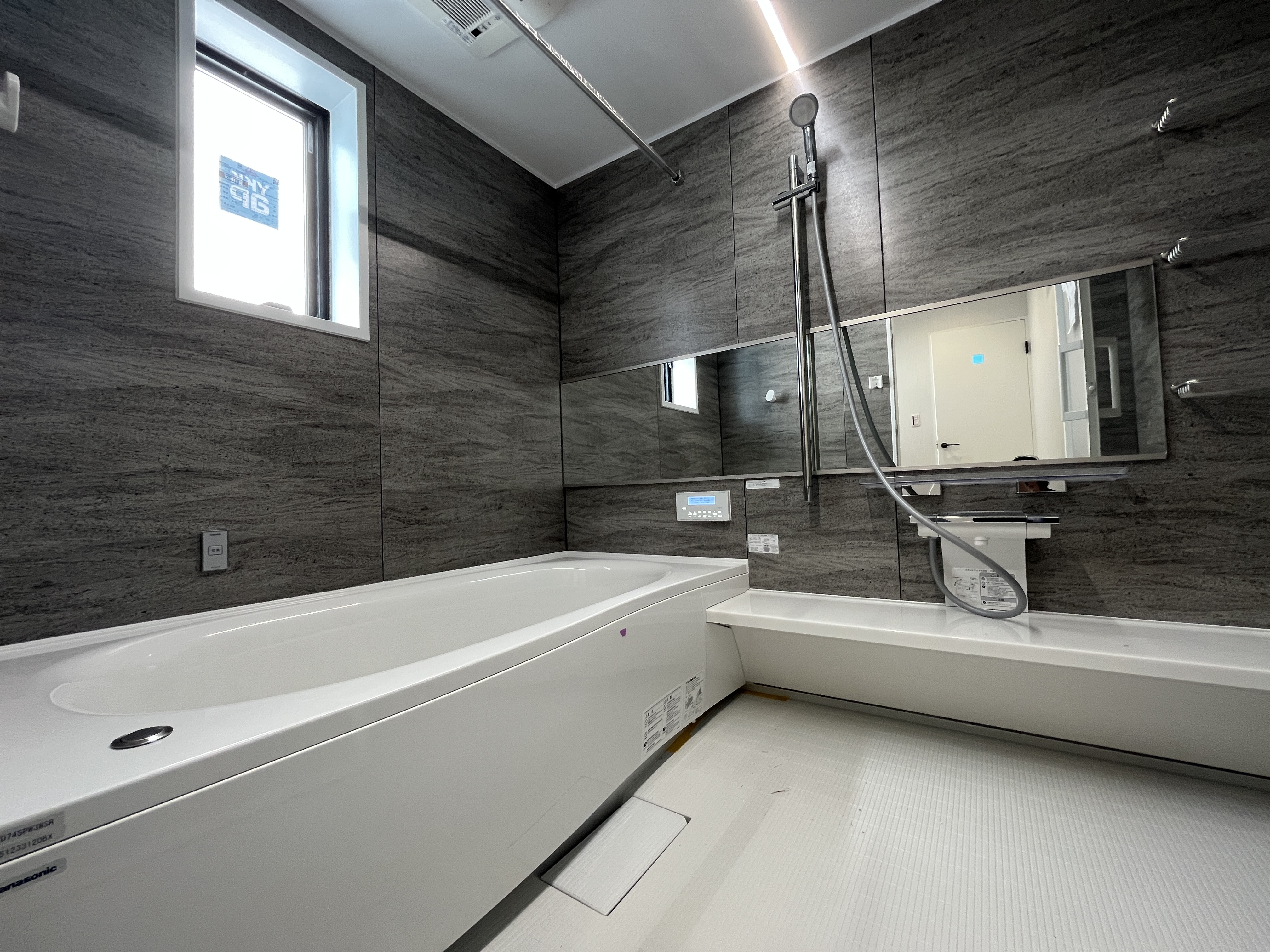 ダークグレーの石目調(または木目調)のパネルが全面に貼られていて、空間に重厚感と落ち着きを与えています。 -