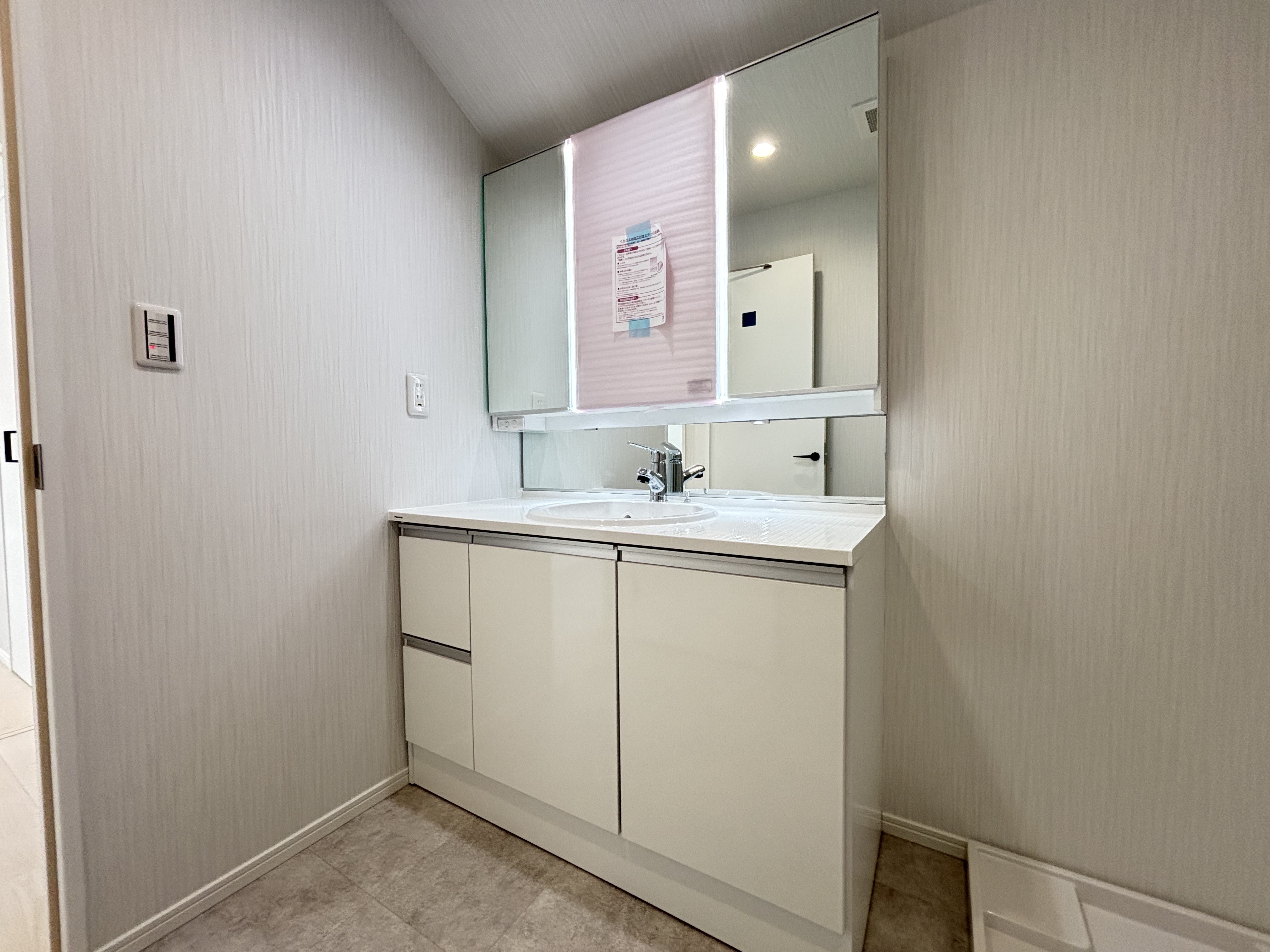 白を基調とした清潔感あふれる洗面化粧台。三面鏡裏の収納や下部収納など、散らかりがちな水回りもスッキリ片付きます。忙しい朝の身支度をスムーズにし、日々の暮らしにゆとりを与えてくれる機能的な設計です。 -