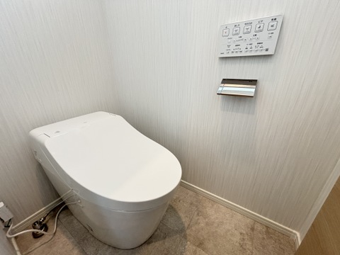 清潔感のあるホワイトで統一された、温水洗浄便座付きのトイレ。小窓が設置されており、自然光による明るさと換気のしやすさを両立しています。シンプルながらも、毎日使う場所だからこその心地よさを追求しました。 -
