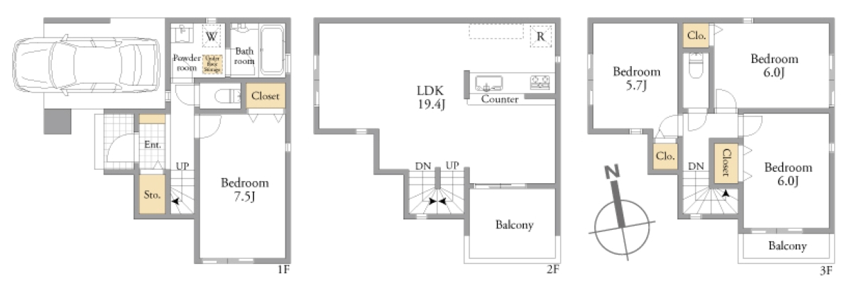 | 土地面積 | 69.37m²(実測) | 建物面積 | 112.5m²(実測) (うち1F車庫面積:9.93m²) |